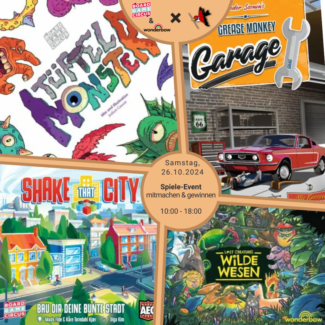 Wir haben 4 abwechslungsreiche Spiele von Board Game Circus und Wonderbow vorbereitet, die für jede Menge Spaß und Unterhaltung sorgen. Egal ob du einfach mal dein Glück herausfordern willst, strategisch unterwegs sein möchtest, oder gerne planst!