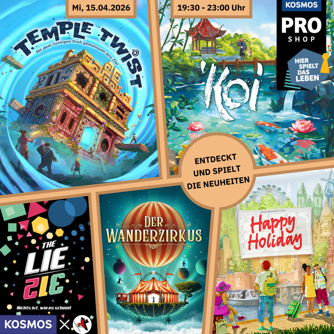 🆕 Temple Twist, Koi, The Lie, Der Wanderzirkus und Happy Holiday werden für euch spielbereit und inklusive Regelerklärung zum Ausprobieren bereit stehen.