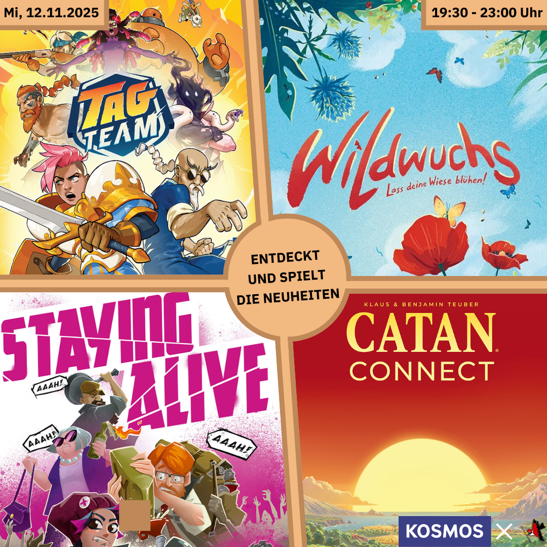 🆕 Tag Team, Wilwuchs, Staying Alive & CATAN Connect werden für euch spielbereit und inklusive Regelerklärung zum Ausprobieren bereit stehen.